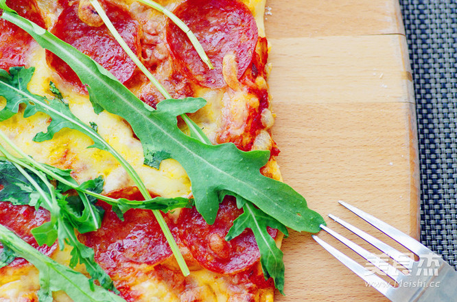 11. 烤好的披薩放上芝麻葉就好了。