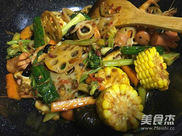 平菇1把 藕1/3截 金針菇1把 火鍋腸1把 蝦1把 魷魚圈1把