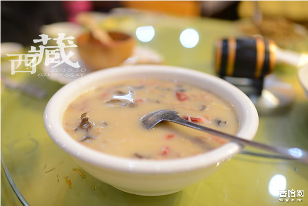 西藏名吃—麥片粥:小麥浸泡后捶扁,曬干,稱為麥片。將麥片、人參果、牛(羊)肉丁、奶渣放骨湯中煮熟即成。