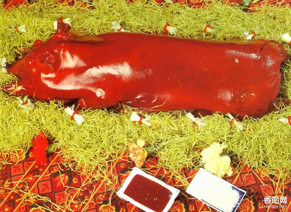 點燃炭火,撥作前后兩堆,將豬頭和臀部烤成嫣紅色后用針扎眼排氣,然后將豬身遍刷植物油,將爐炭撥成長條形通烤豬身,同時轉動叉位使火候均勻,至豬通身成大紅色便成。上席時一般用紅綢蓋之,廚師當眾揭開片皮。