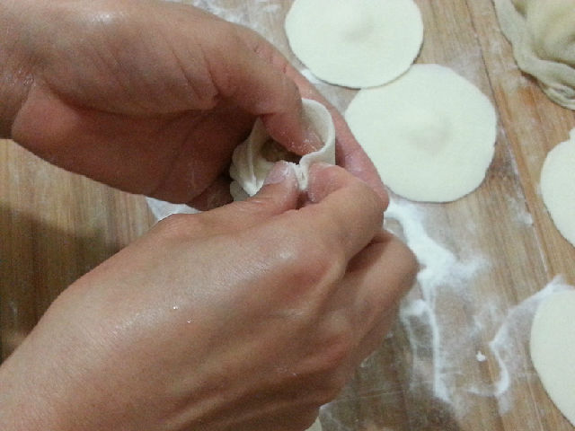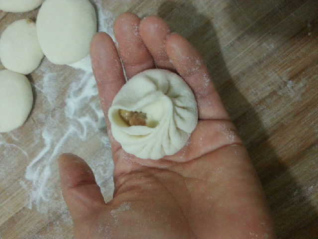 左手的大拇指可以幫助把肉餡往下壓,右手的食指在捏褶的時(shí)候可以稍微上提,這樣的小包子的才會(huì)裝比較多的餡。