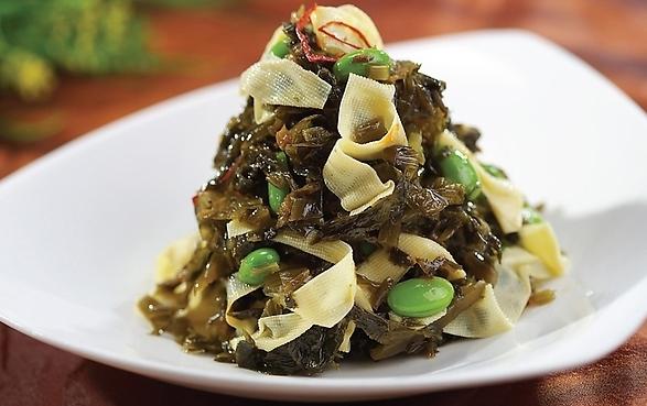 5.起油鍋加5大匙油,加入辣椒炒香,放入雪里蕻拌炒片刻,最后放入百葉拌炒,加調(diào)味料拌勻。