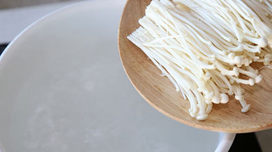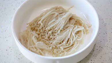 1、水煮至沸騰以后,加入清洗干凈的金針菇,焯至水再次沸騰即可。