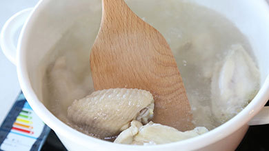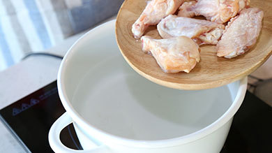 1、雞翅、雞腿清洗干凈后,冷水入鍋,同水一起加熱。