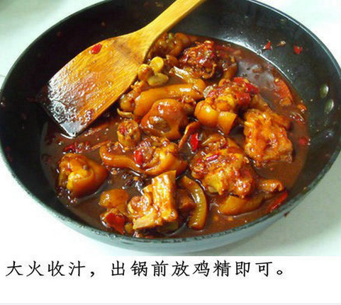 5、把豬蹄重再倒入炒鍋中,加鹽調(diào)味,大火收到汁濃關(guān)火。