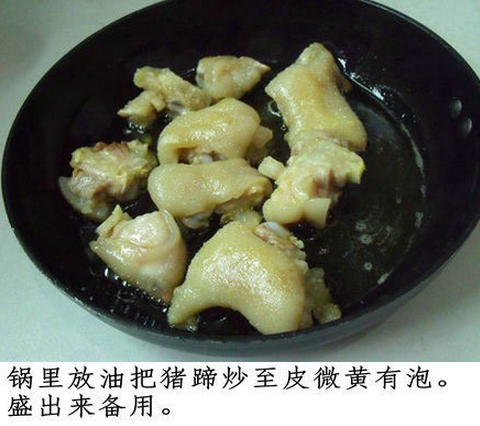 3、加入豬蹄和其它調(diào)料炒到豬蹄上色。
