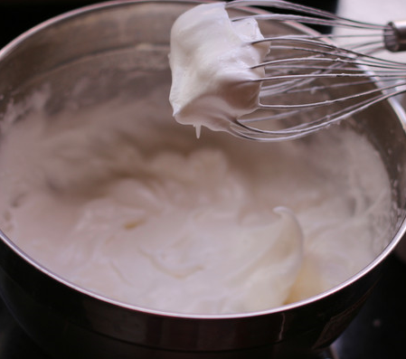 5.蛋清里加入少許鹽和檸檬汁,分三次加入糖,打發(fā)至硬性發(fā)泡;