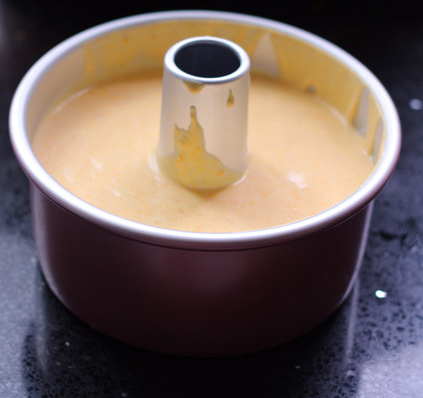 7.把所有蛋清和蛋黃南瓜面糊拌勻,倒入模具;