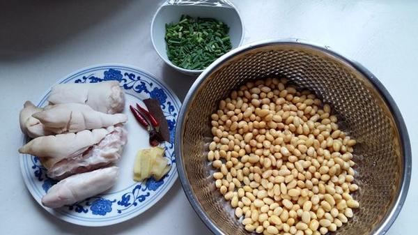 做法:1.黃豆提前用清水浸泡四小時(shí)以上,冬天可過夜,夏天放冰箱冷藏浸泡。豬蹄清洗干凈剁塊。生姜去皮洗凈切片,青蒜洗凈切末。