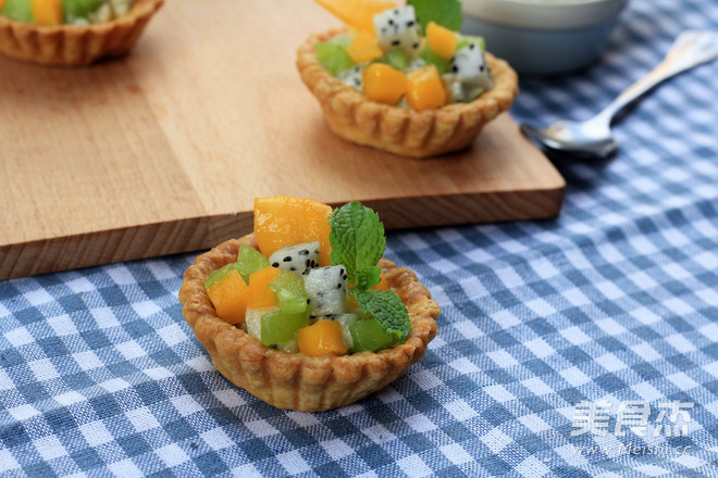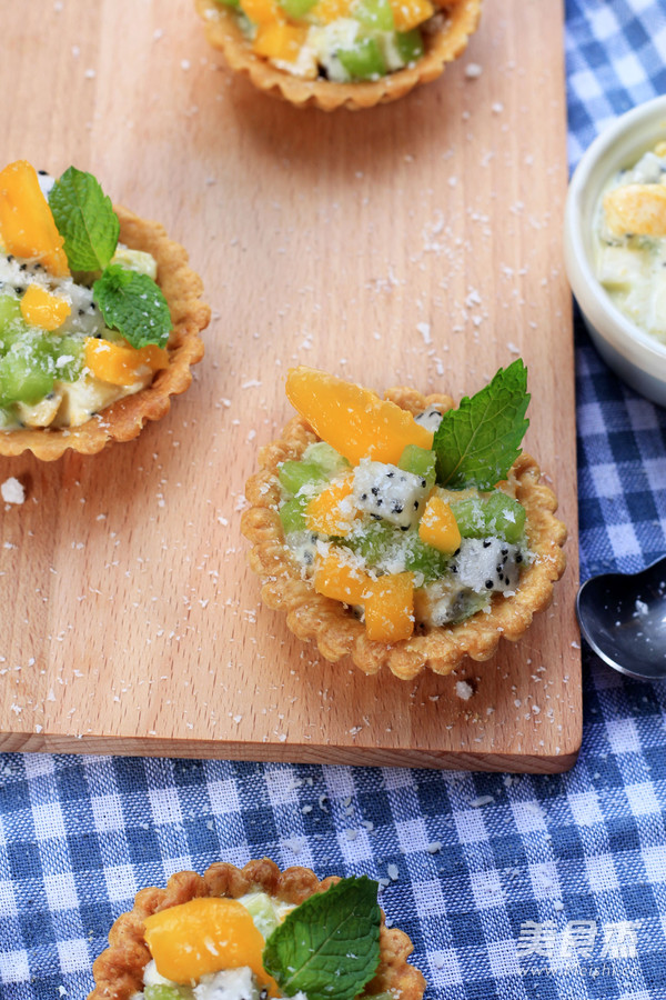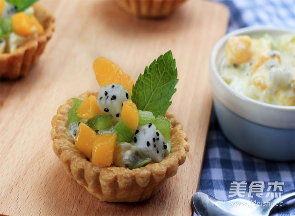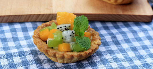 14.每個(gè)塔皮里裝入適量水果沙拉即可