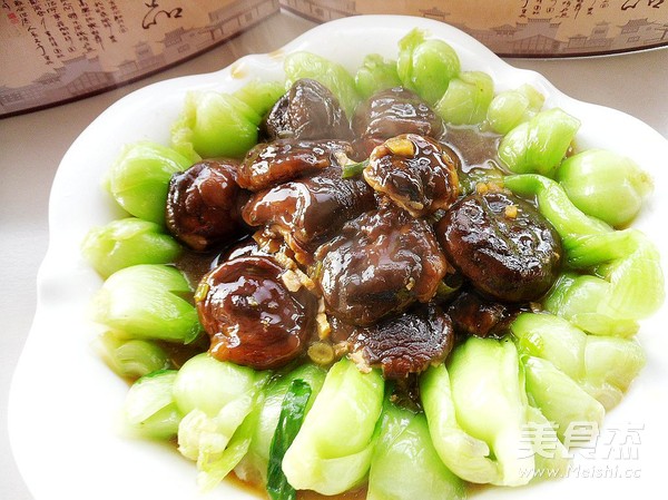 12. 把燒制好的香菇澆入備用的油菜盤中,即可上桌品味