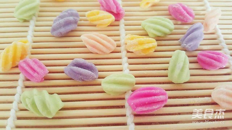 12. 最后再做一種貝殼面,把面搓成小球,用大拇指在壽司簾上一捻,一個(gè)小貝殼就做好了。