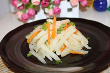 1、將沙葛和胡蘿卜去皮后切絲。