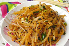 3、翻炒過程中可以加入少量清水,菜絲變色之后調(diào)入味精、鹽,翻炒均勻,撒上蔥段翻炒幾下即可出鍋。