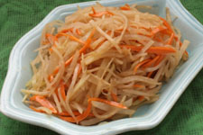 1、將苤藍(lán)皮削掉后切成絲,胡蘿卜洗干凈刮去皮后切成絲。