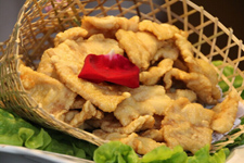 5、里脊下鍋炸至外表凝固,然后油溫升至7成,復(fù)炸至金黃色;