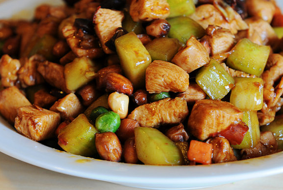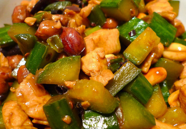 宮保雞丁選用雞肉為主料,佐以花生米、黃瓜、辣椒等輔料烹制而成。 紅而不辣、辣而不猛、香辣味濃、肉質(zhì)滑脆。由于其入口鮮辣,雞肉的鮮嫩配合花生的香脆。