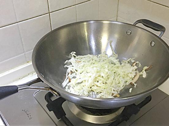 3.入白菜葉同炒,放少量白糖、料酒、生抽。