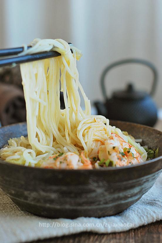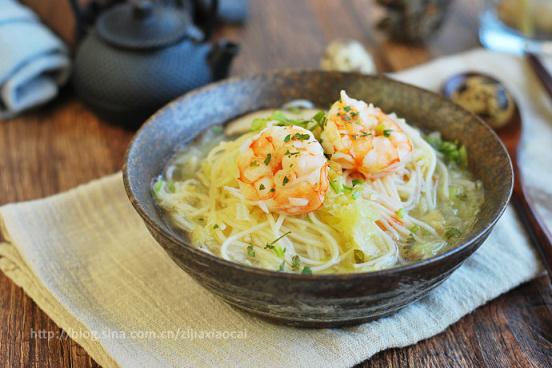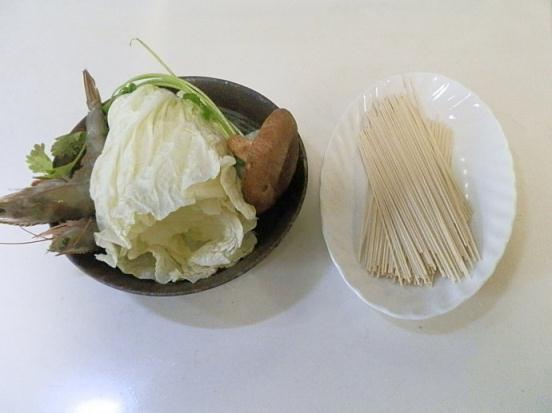 原材料:白菜葉、香菇、蔥、姜、蒜、香菜、青蝦、掛面(生鮮面)、水。