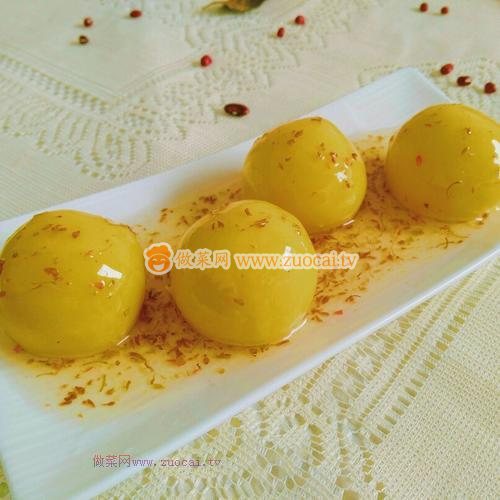 9.擺盤淋上糖桂花,糖桂花非常稠像果凍特別是冬天,最好+溫水給調(diào)適下,2比1的量來(lái)調(diào)勻。淋上糖桂花即可食用。