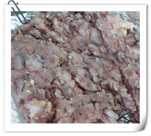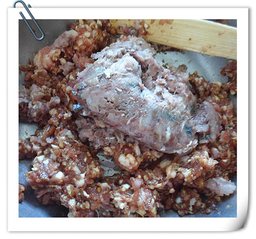 6、加入鲅魚糜,加料酒,白胡椒粉,分幾次加水,攪拌成軟硬適中的肉餡。