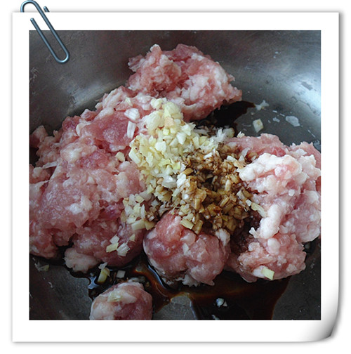 5、豬五花肉餡,加入蔥姜,醬油調勻。