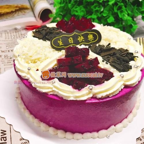 蛋糕底:6寸戚風(fēng)(2片) 慕斯糊:玫瑰火龍果(約350g) 淡奶油(200g) 裝飾:淡奶油(50g) 白巧克力碎(適量) 黑巧克力碎(適量) 玫瑰火龍果(適量)