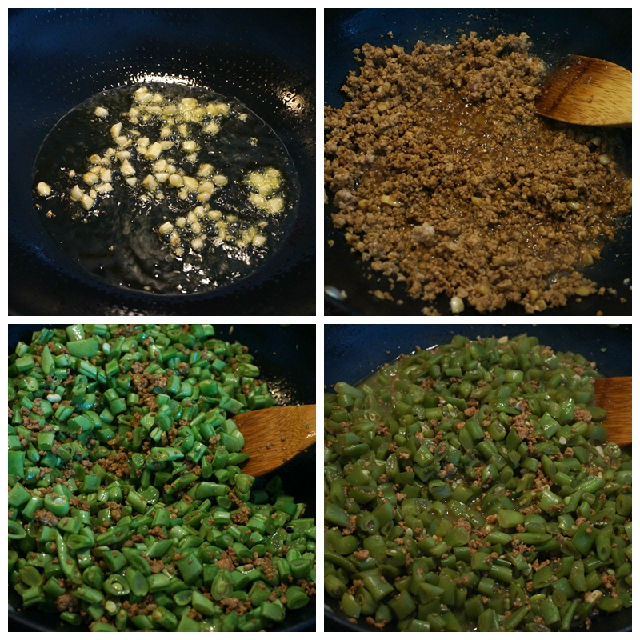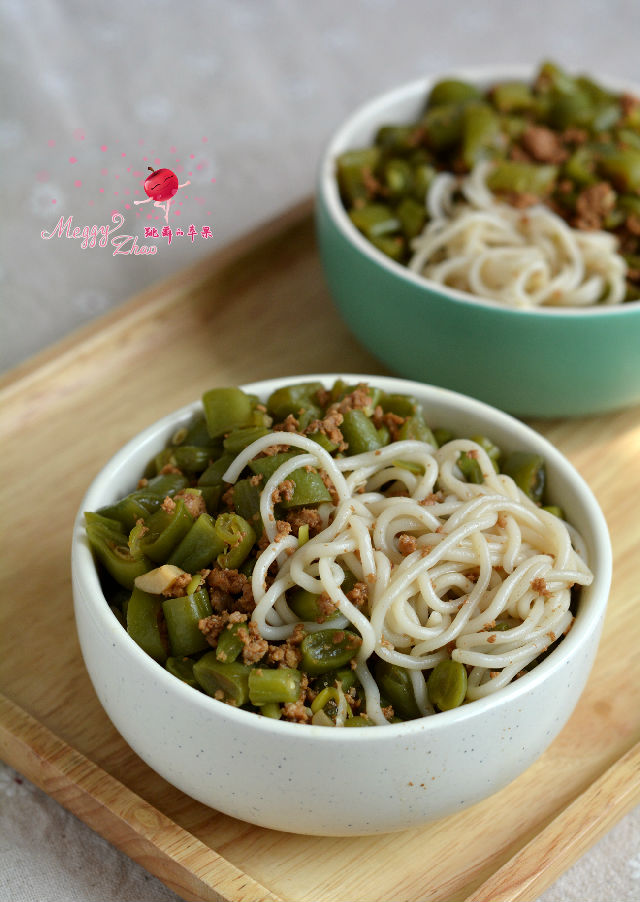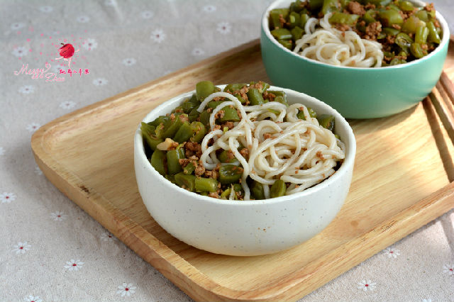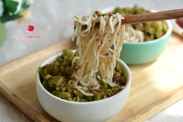 材料:豆角600克,豬肉餡300克,植物油適量,大蒜4瓣,醬油適量,鹽適量,面條適量