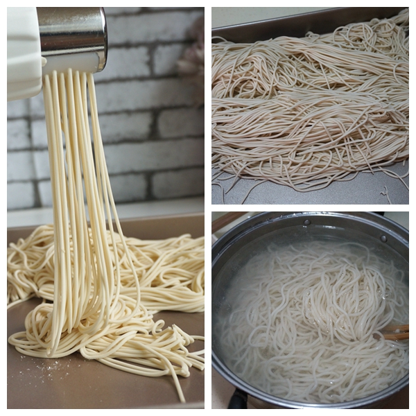8. 燜豆角的時候,用面條機壓出面條來;同時坐一鍋開水一會兒煮面條用;