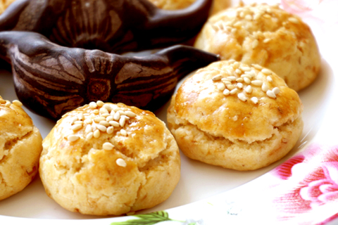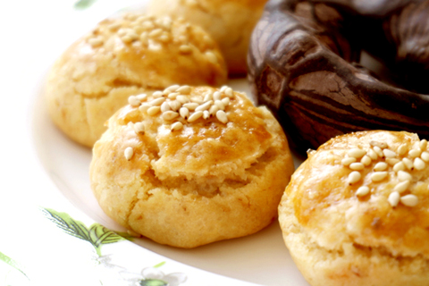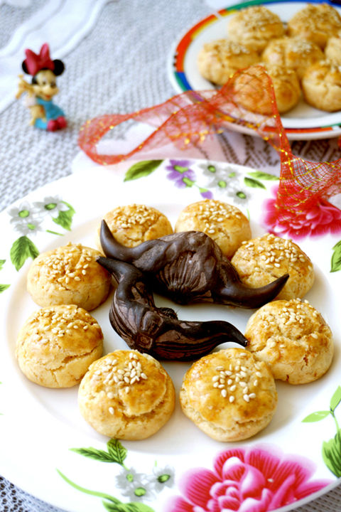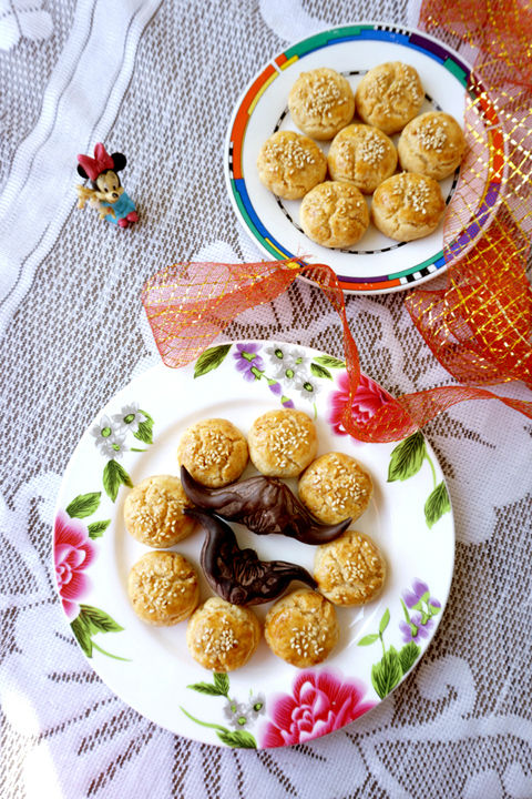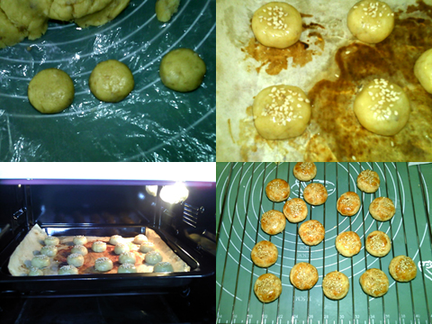2、取適量,做成均勻小圓餅狀。擺入烤盤(pán),表面刷蛋液,粘上芝麻,放入烤箱,中層,上下火,180度,烤約20分鐘左右。表面金黃,出爐。