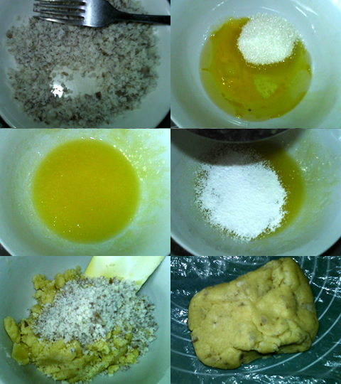 1、菱角去殼取肉,碾碎。蛋液,糖,油倒入碗中。攪打至充分乳化。面粉,泡打粉,小蘇打混合,篩入糖油液中,拌勻。加入菱角泥,拌勻成均勻面團(tuán)。