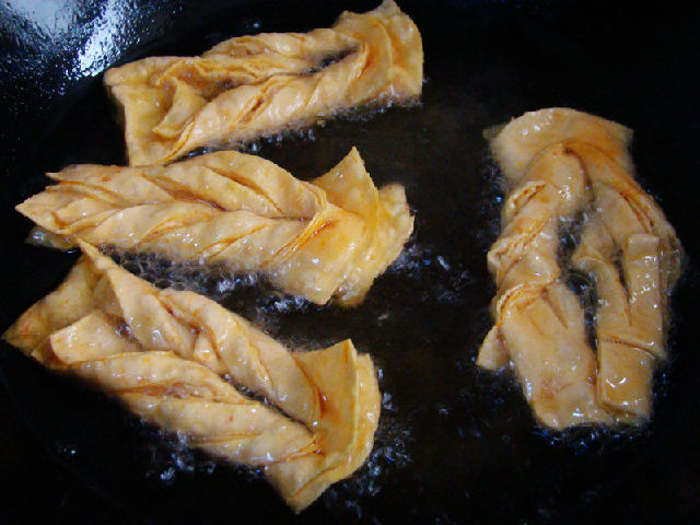 9,鍋里加入適量油,將做好的排叉放入鍋中用中小火炸,用筷子不斷翻面。