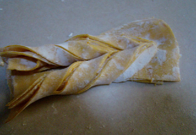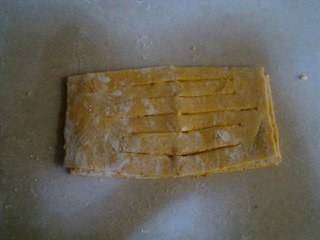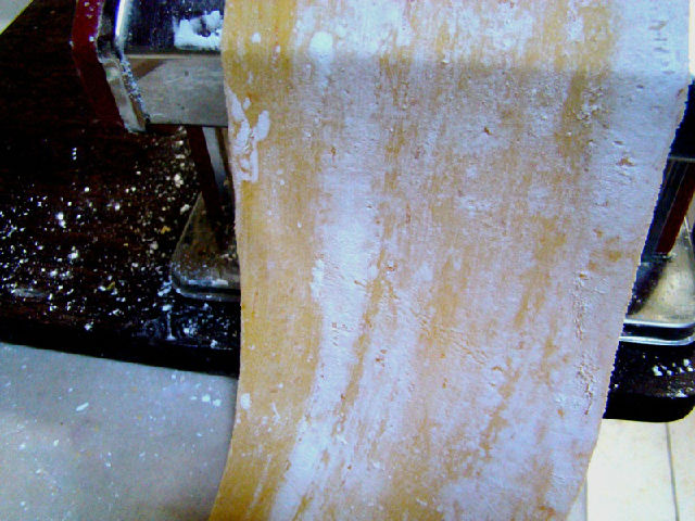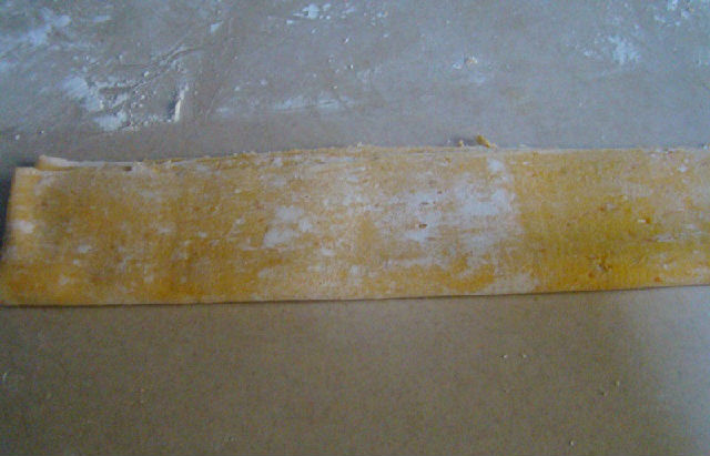 4,分成適當?shù)膭┳?,灑上少許玉米淀粉,用面條機通過調檔反復軋,最后軋出較薄一點的面片。