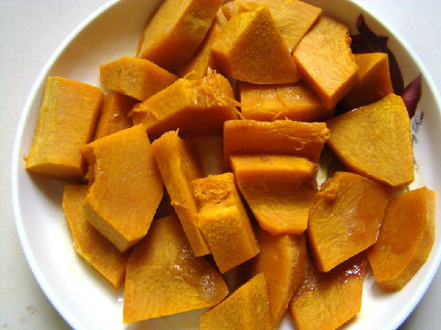 1,南瓜去皮切片用微波爐叮熟。