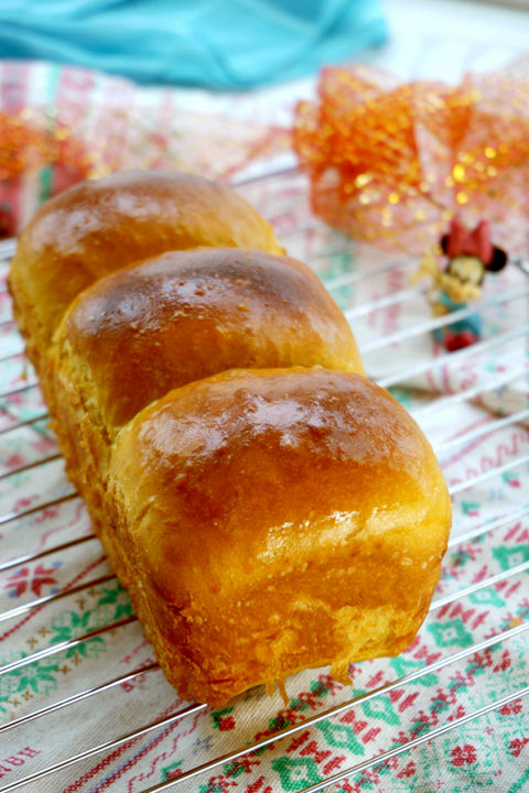 芒果土司,分量減半,做成小土司,正好把那盒冷凍芒果泥的剩余部分解決掉。