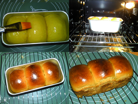 3、面團(tuán)長(zhǎng)至八九分滿(mǎn),表面刷蛋液。放入烤箱,中下層,上下火170度,烤約25分鐘左右。表面金黃,出爐,立即脫模,晾涼。