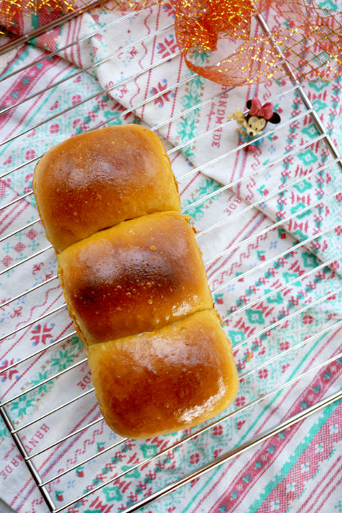 氣溫驟降,冬天一下子就到了,很突然,很意外。小土司的成長(zhǎng)也因此變得艱難起來(lái)。終于長(zhǎng)到模具上緣。天空陰沉,或許還有一場(chǎng)雨,一場(chǎng)冷。烤箱很溫暖,金燦燦的芒果黃也呈現(xiàn)著融融暖意。。。。