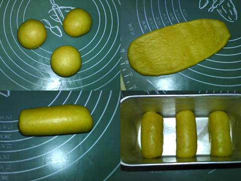 2、排氣,分割成三等分,滾圓,松散10-15分鐘。搟成橢圓形,卷起。放入抹油的模具中,最后發(fā)酵。