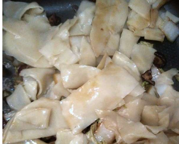 7.接下來(lái)就可以倒入之前煮過(guò)的水餃皮(過(guò)了涼水的皮超級(jí)Q哦)繼續(xù)炒至水餃皮熟透