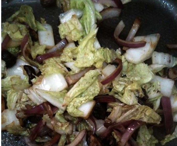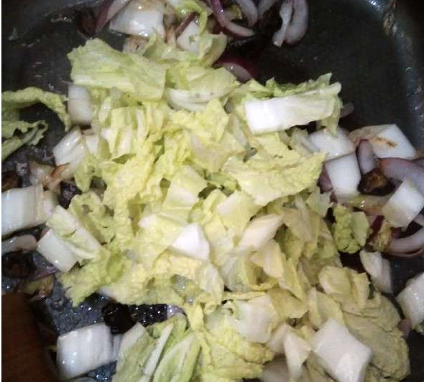 4.炒出香菇大蔥洋蔥的香味后就可以先放大白菜梗翻炒一下(梗粗不容易熟所以先炒)