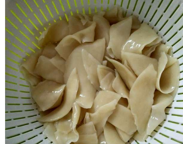 3、依次把準(zhǔn)備好的餃子抻扯成長(zhǎng)款的薄片。