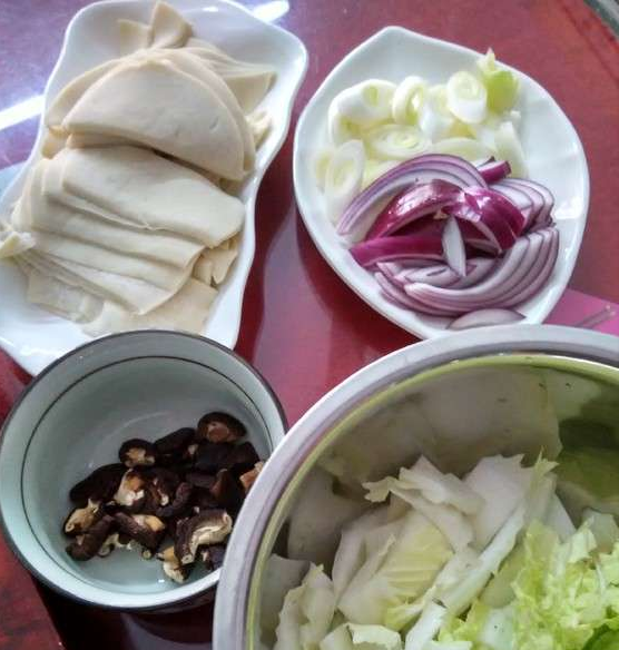 1.先準(zhǔn)備好所需要的材料,水餃皮切片泡好香菇洋蔥切條大蔥切段(洋蔥香菇提味)大白菜切好全部準(zhǔn)備好備用