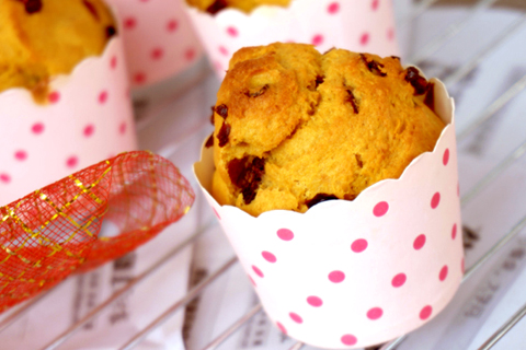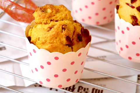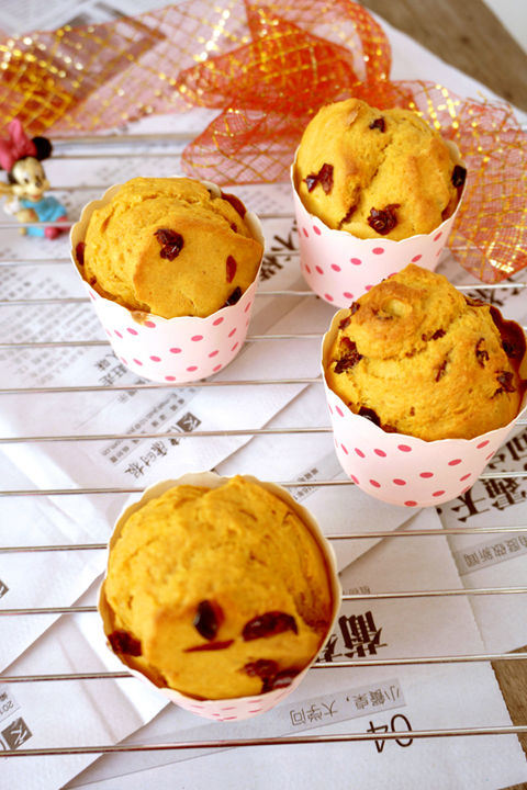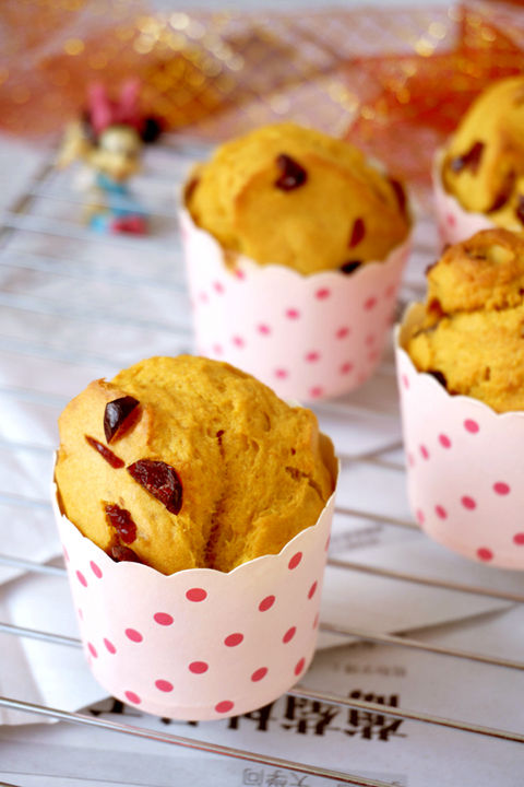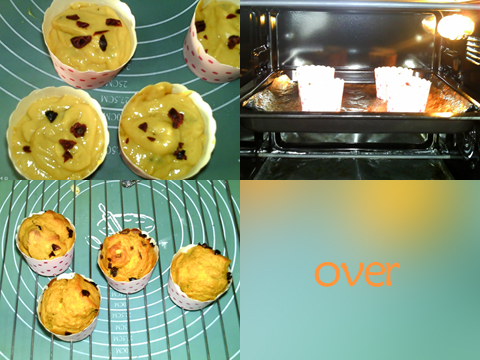 2、裝入紙杯中,七八分滿,表面撒少許蔓越莓點(diǎn)綴。放入烤箱,中層,上下火180度,烤約25-30分鐘。表面輕微上色,出爐。