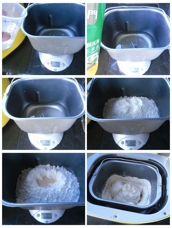1、往面包機內(nèi)筒先加清水280g(水有點多,可以減量)