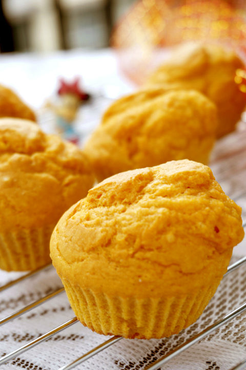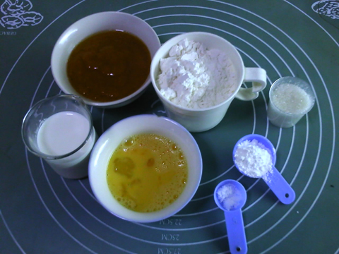 用料:低筋粉100克,糖25克,泡打粉6克,鹽1克,雞蛋20克,牛奶80克,芒果泥120克