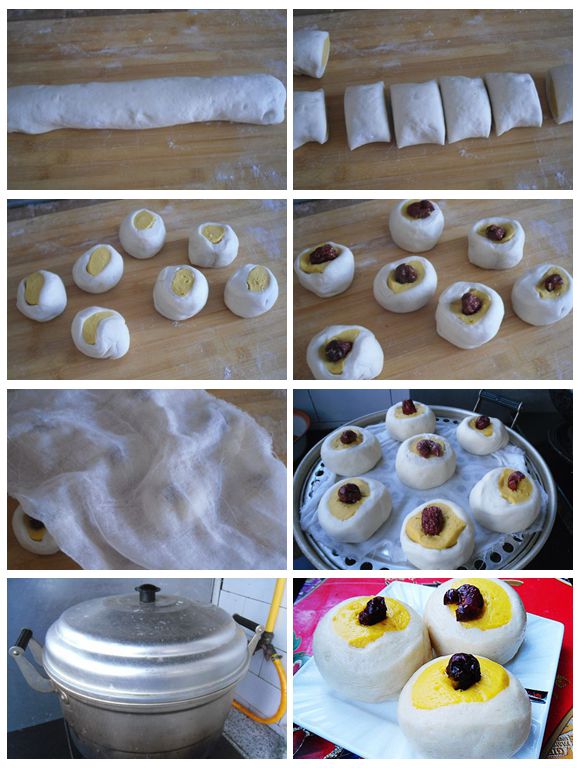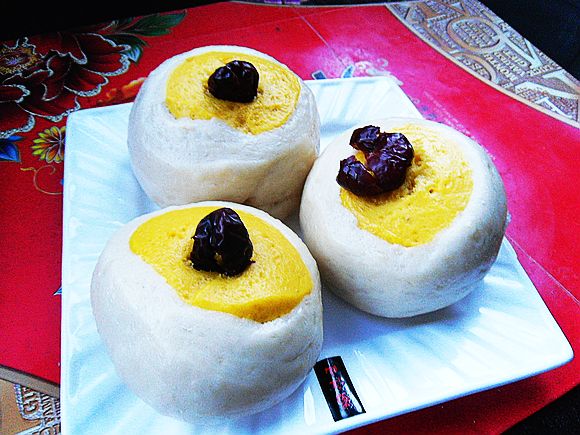 這款栆饃饃,是用金黃色的南瓜泥和成的面團(tuán)做芯,用白色的面團(tuán)將其包卷而成,所以叫做“銀包金”。最后用大紅棗點綴蒸制而成,所以就取名:【銀包金栆饃饃】。這是一款栆香味濃郁的面點。