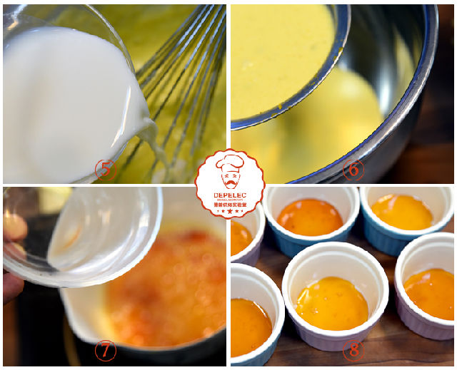 7、制作焦糖:冷水和剩余的細(xì)砂糖放入不沾鍋中,中火加熱,不必?cái)嚢?,待變成棕紅色的時(shí)候關(guān)火,馬上倒入20g沸水