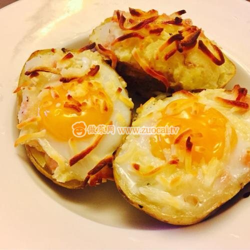 2.烤熟的土豆用勺子挖出大部分土豆,洋蔥火腿切丁