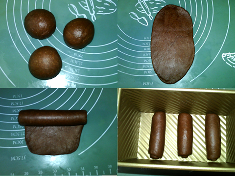 2、排氣,分割成三等分,滾圓,松弛10分鐘。搟成橢圓形。卷起。收口向下,放入模具中。進(jìn)行最后發(fā)酵。