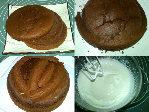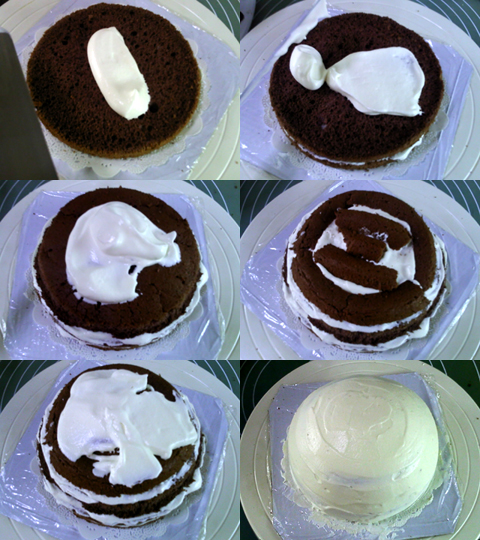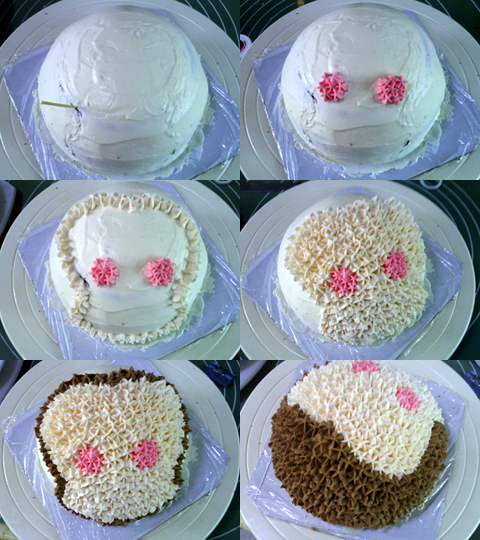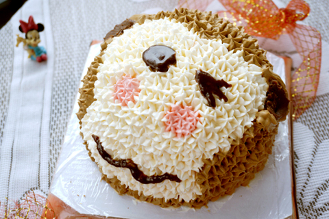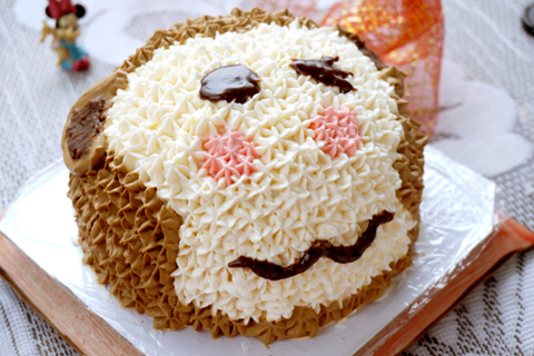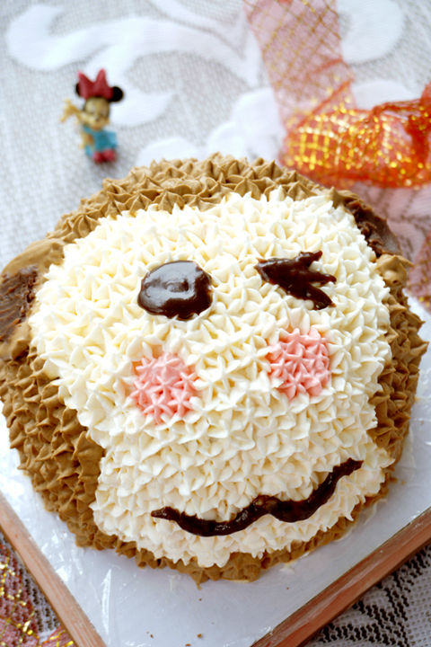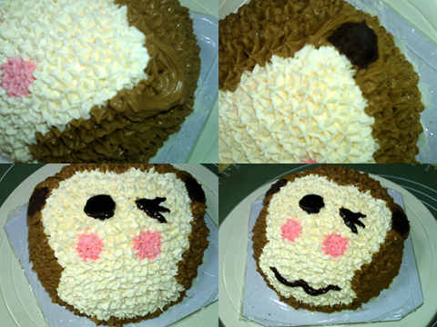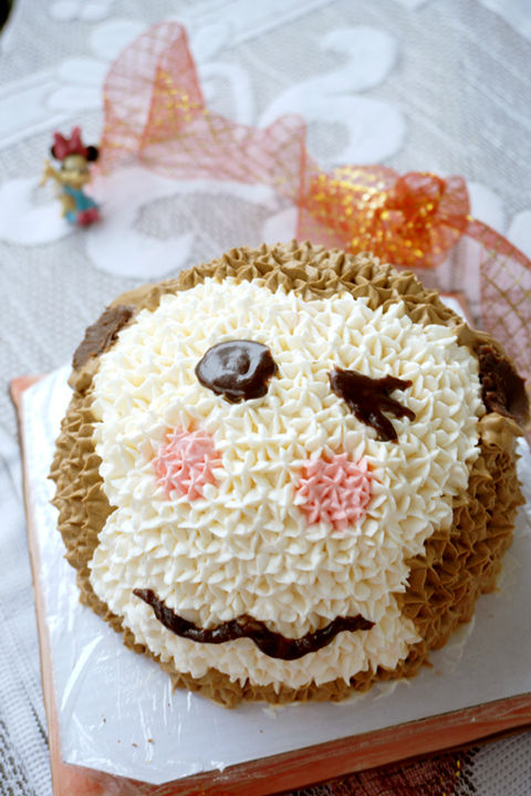 可可戚風做坯,可以配合小猴的棕色猴毛。而為了配合可可戚風的味道,在打棕色奶油的時候又加了些許可可粉,讓奶油也帶上可可的味道?;蛟S用巧克力醬什么的會更好,不過當時沒想起來。